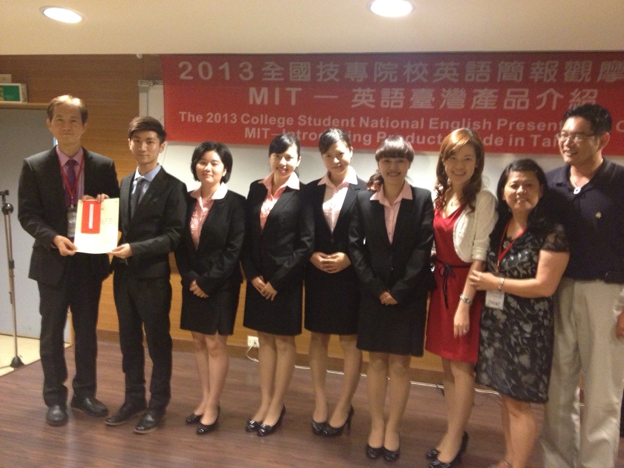 『2013全國技專校院英語簡報觀摩競賽』 5月10日在崑山科技大學進行決賽,競賽主題“MIT—英語臺灣產品介紹”,由應用外語系王生美教授和林羣富教授指導一參賽隊伍,帶領林恩慈、張語玲、許巧琳、高渝琁及許哲偉等五人,以作品“Carnation Touch Your Heart”,榮獲冠軍,凸顯出該系在專業領域的堅強實力。